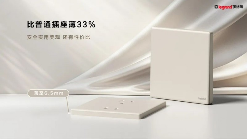 罗格朗智绘系列超薄6.5mm面板,比普通插座厚度薄了33%,紧握当下主流审美,设计整体更简约、时尚。在品质和价格上具备优势,设计上,开关采用2.5D轻弧面板,造型圆润饱满大气,立体造型线条流畅,可满足极简美学、品质家居的轻奢装修风格。