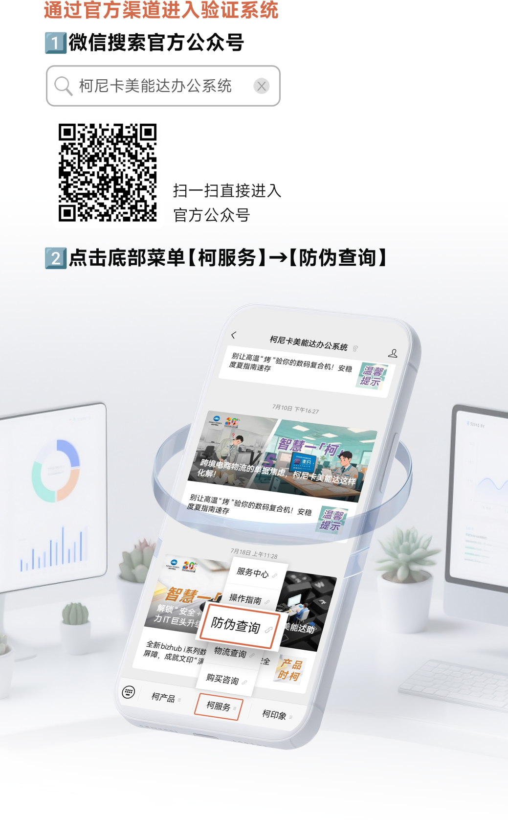 2.官方查验:用户可直接通过微信搜索柯尼卡美能达官方账号——“柯尼卡美能达办公系统”,点击微信公众号底部菜单栏选择“柯服务”,进入“防伪查询”页面。