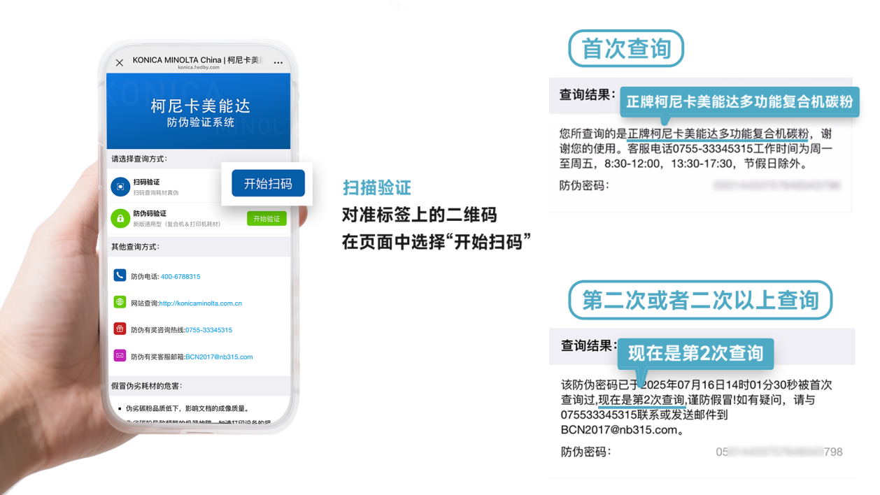 3.扫码验证:将手机对准碳粉标签背面的防伪二维码,在页面中选择开始扫码。若页面显示是首次查询,则证明购买到的是柯尼卡美能达Simitri V碳粉;若页面显示的是第二次查询,请用户谨防假冒,可联系官方电话0755-33345315进一步咨询查证。(注:客服电话工作时间为周一至周五,8:30—12:00,13:30-17:30,节假日除外。)