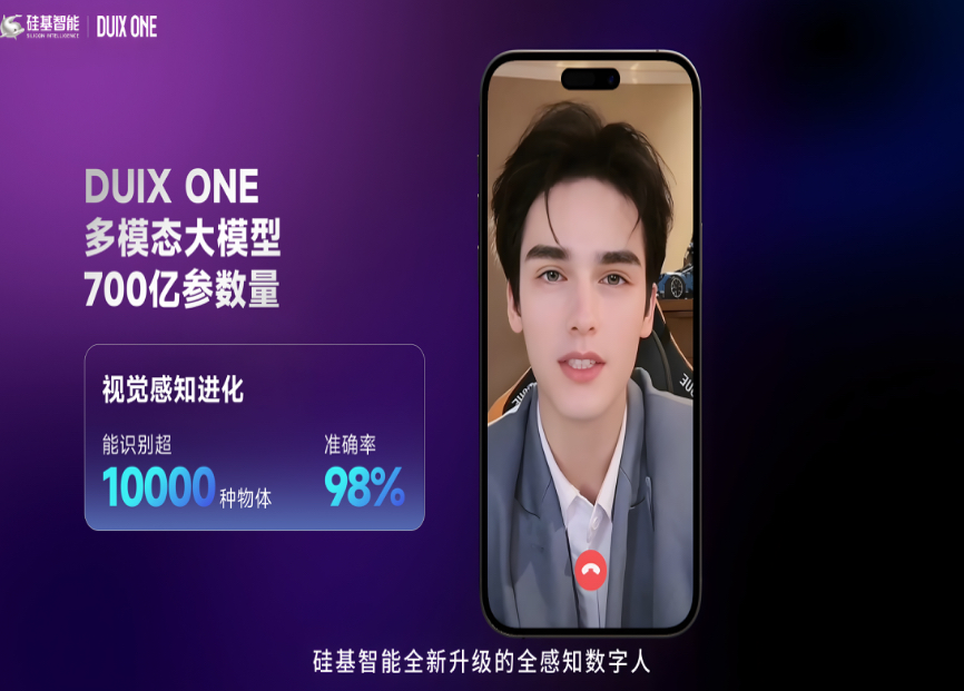 图:硅基智能最新推出的DUIX ONE多模态大模型示意,集视觉、听觉、语言、情绪等感知与交互能力于一体。该模型具备70亿+参数规模,支持4K级视觉识别和毫秒级语音响应等特性,有效提升了数字人的智能表现力。