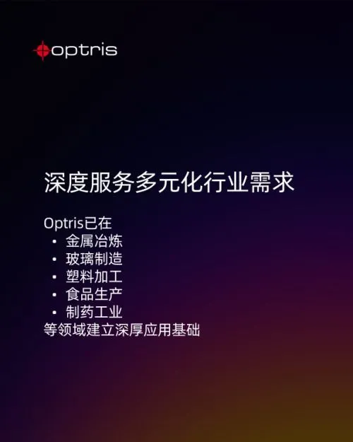 Optris已在金属冶炼、玻璃制造、塑料加工、食品生产、制药工业等领域建立深厚应用基础。