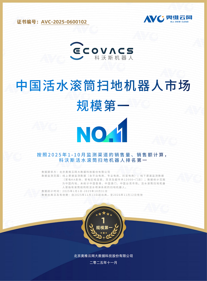 此次奥维云网的权威认证,不仅再次确认了科沃斯在滚筒赛道的领先地位,也进一步强化了“滚筒洗地机器人=科沃斯”的行业共识。2025年被业内视为扫地机的“滚筒年”,科沃斯将在连续十年中国市场规模第一的基础上,以此次认证为新的起点,坚持以技术创新为核心驱动力,以引领者之姿推动行业持续跃升,带动智能清洁行业迈向更高质量发展,为用户提供更高效、更可靠的清洁体验。