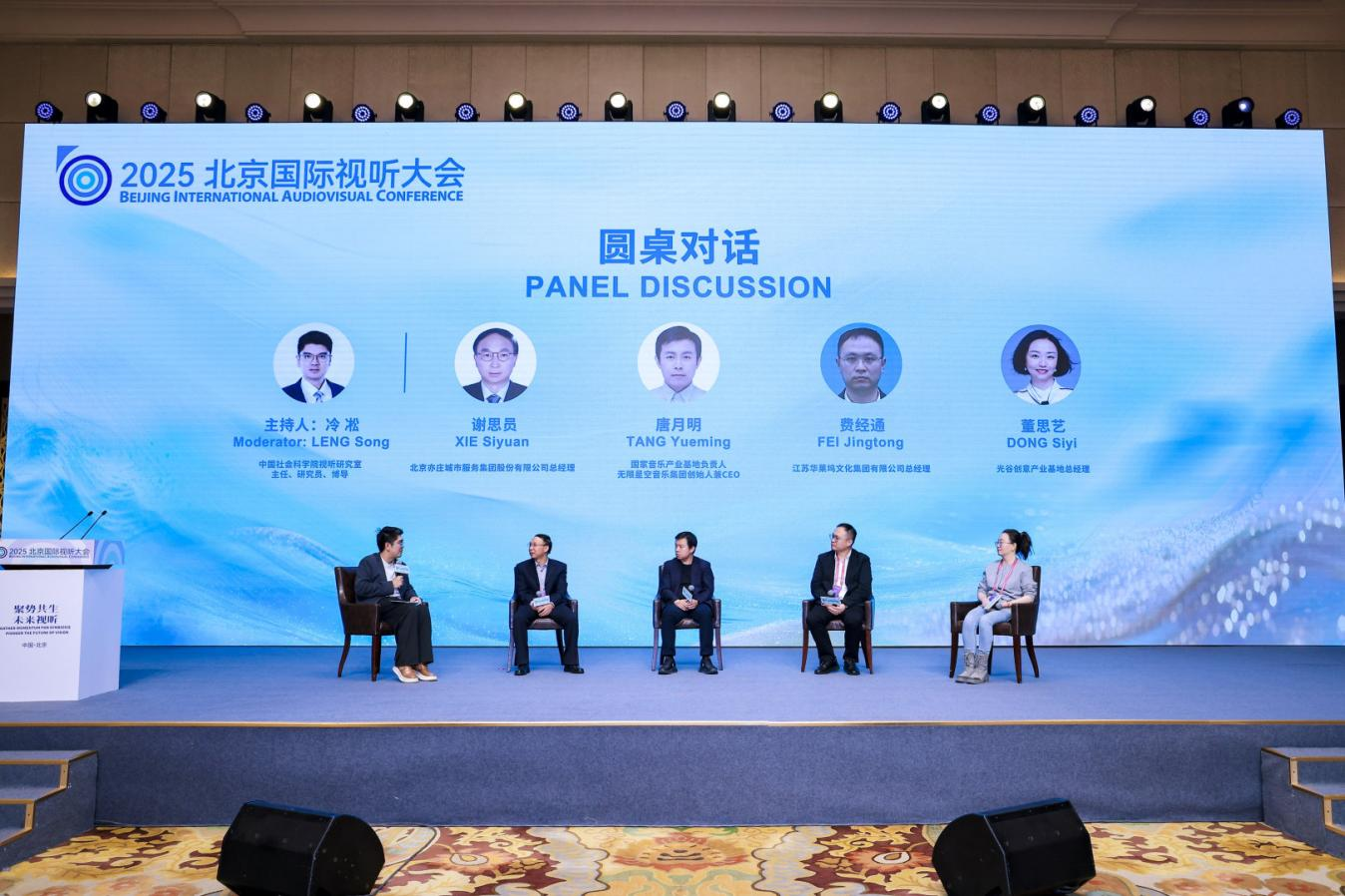圆桌论坛环节,北京亦庄城市服务集团总经理谢思员,国家音乐产业基地负责人、无限星空音乐集团创始人兼CEO唐月明,江苏华莱坞文化集团有限公司总经理费经通,光谷创意产业基地总经理董思艺围绕“园区如何助力视听产业发展”“AI赋能与未来场景”“招商与育商”等议题展开深度对话,精彩发言为视听产业未来发展提供了宝贵的思路和方向。