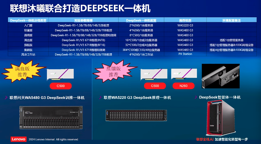 信息显示,今年2月,联想集团与沐曦股份联合推出"DeepSeek国产AI一体机",采用"联想服务器+沐曦股份训推一体GPU+自主算法"架构,并共享推广渠道,通过举办行业实践研讨会、拓展三方合作等形式,联合开展解决方案的行业应用及细分场景适配,仅40天即实现千台交付、近万卡出货,覆盖医疗、教育、制造等十余个核心行业,成为国产AI落地最快、规模最大的标杆案例。