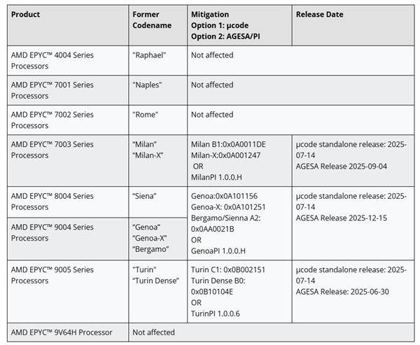 针对存在此低危漏洞的Zen 3/4/5架构的EPYC产品,AMD也早已发布解决措施,只需更新相应的固件版本即可。