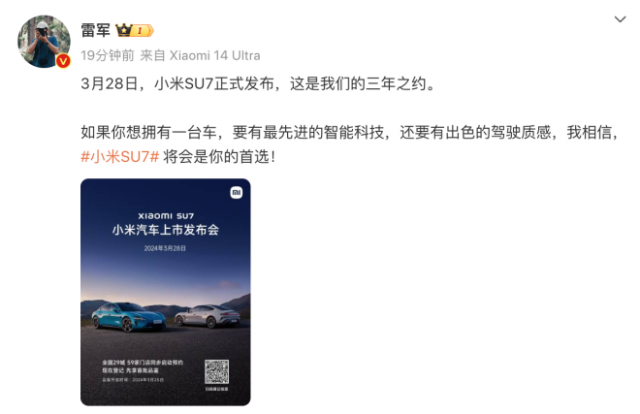 今日早间,小米创办人、董事长兼CEO雷军在微博宣布,“3月28日,小米SU7正式发布,这是我们的三年之约。”
