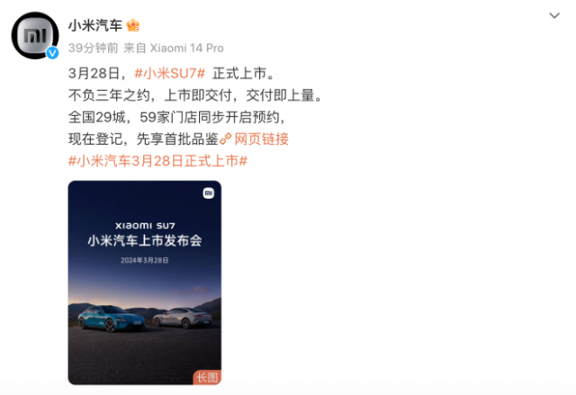 小米汽车官微发文称,小米SU7上市即交付,交付即上量,并首次对外公布了小米汽车门店详细信息,首批小米汽车门店覆盖全国29城市,共计59家门店。