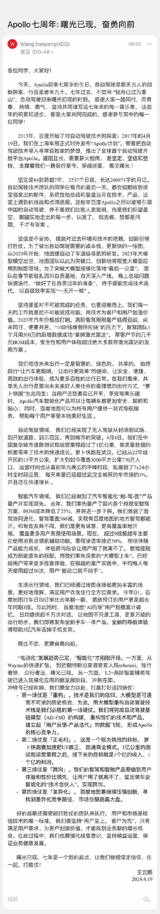 据相关媒体报道,王云鹏在上任百度集团副总裁、智能驾驶事业群组总裁后首度发布全员信。王云鹏在信中称,百度Apollo将聚焦四场硬仗——完成自动驾驶基础模型构建、萝卜快跑毛利转正并跑通商业模式、智驾智舱产品实现用户体验和性价比领先、百度地图差异化竞争及市场份额跑赢大盘。王云鹏透露,百度即将发布手车一体的地图产品,将帮助3亿汽车扔掉手机支架。