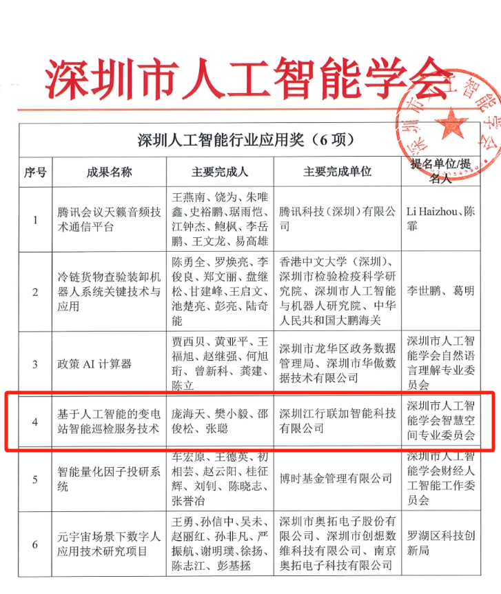 4月16日,2023年度第三届“深圳人工智能奖”名单正式公布,凭借在人工智能领域的深入研究及智能巡检领域的实际应用,江行智能「基于人工智能的变电站智能巡检服务技术」获得“深圳人工智能行业应用奖”。