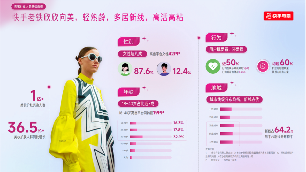 这些新线人群对于美妆的需求是什么呢?在快手平台上,对美妆、护肤内容感兴趣的人群超过了1亿人,是接近40%的增长率,主要集中在18岁-40岁的年龄阶段。从行为上来看,美妆的用户是既爱看还要搜,其中接近50%的用户日均刷视频超过1小时,超过60%的用户是在观看完相关的内容后就会有搜索的行为,是一个非常确定的消费场景。