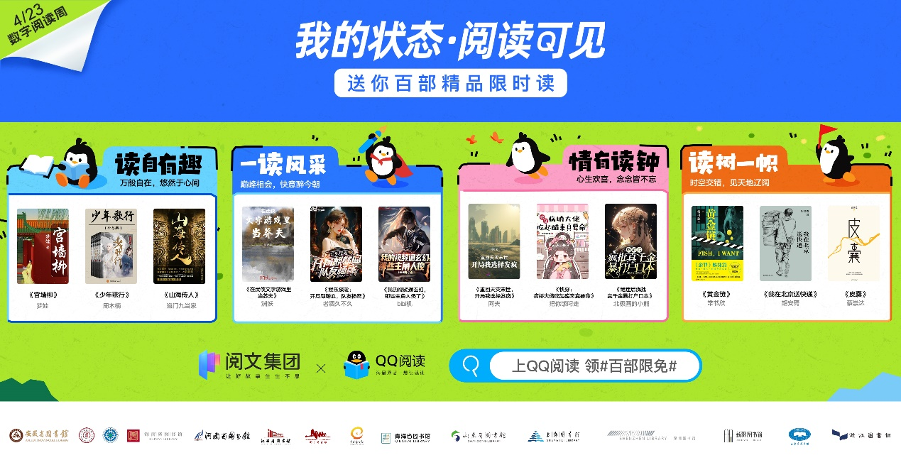 4月22日,在第29个世界读书日来临之际,阅文集团旗下QQ阅读上线“数字阅读周”书单,推荐500多本好书并开启限免阅读。本次活动由QQ阅读联合上海图书馆等15家公共图书馆,中央文献出版社、人民文学出版社、人民邮电出版社等73家出版单位共同发起,将延续至5月5日,旨在推广全民阅读,助力“书香社会”建设。