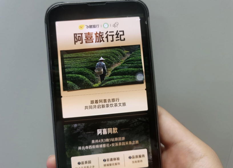 4月26日,飞猪宣布与喜茶、中国茶叶流通协会联合推出茶旅跟团游新品,4天3晚的行程让旅客深入探索乌龙茶之乡——福建安溪。记者在商品介绍中看到,除了常规的茶山茶园观光外,该产品融入了采茶制茶、新茶品鉴、参观国营老茶厂、研习制茶非遗技艺等互动体验。此外,行程中还包含打卡蚵壳厝老街区、蟳埔村簪花等经典泉州游项目。