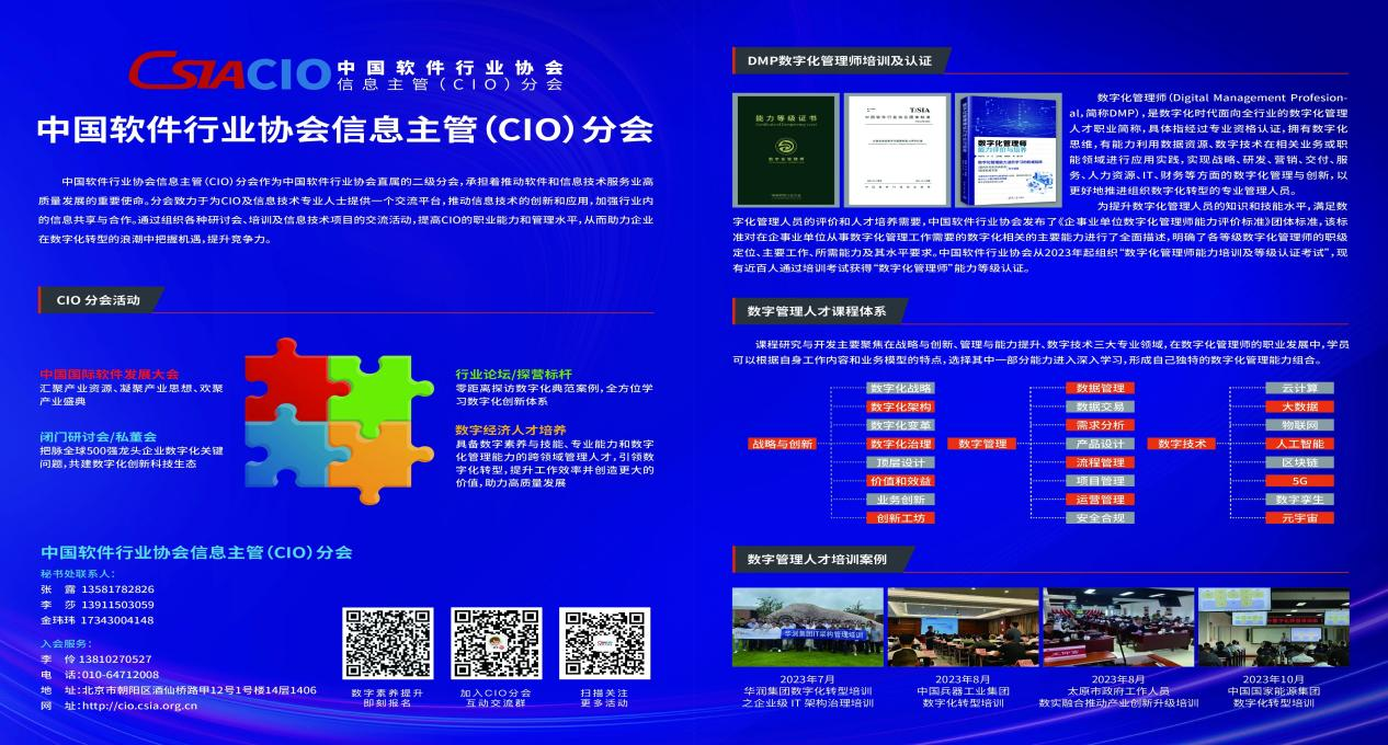 一是开展数字化管理师及数字人才相关培训,为数字时代发展提供有力的人才保障。过去一年,CIO分会在全国范围举办了多场培训及认证考试,以及与太原市政府、上汽通用集团、中国兵器工业集团、中国国家能源集团合作开展的数字人才培训,百余人通过我会组织的培训及考试拿到了相应等级的数字化管理师证书,得到学员们的良好反馈。2024年,随着技术的快速发展和市场竞争的日益激烈,企业对于数字人才的需求也日益迫切。我们将不断优化培训内容和方式,以适应数字化变革的快速变化和不断深入,帮助学员全面提升数字化管理能力和素质。同时,我们还将加强与企事业单位的合作,提供更加贴合实际需求的培训服务,助力企业实现数字化转型和升级。