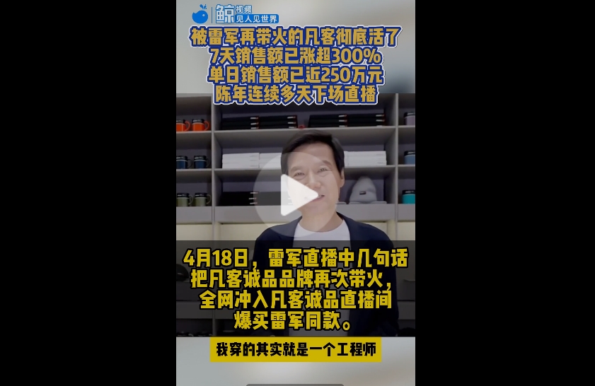 据媒体报道,在过去的7天内,凡客诚品销售数据已实现爆发式增长。在4月18日雷军直播之前,凡客诚品官方旗舰店销售额多在1万-2.5万元左右。