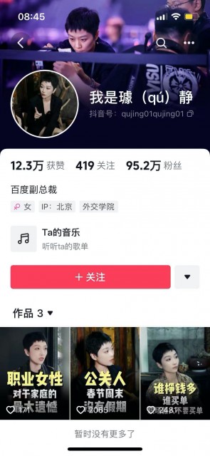 抖音账号“我是璩(qú)静”,认证为百度副总裁