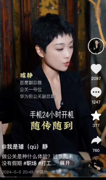 这个五一假期,百度副总裁、公关一号位璩静搞起了自媒体,其抖音账号发布4个视频粉丝就涨到了95万+,收获12.3万赞。