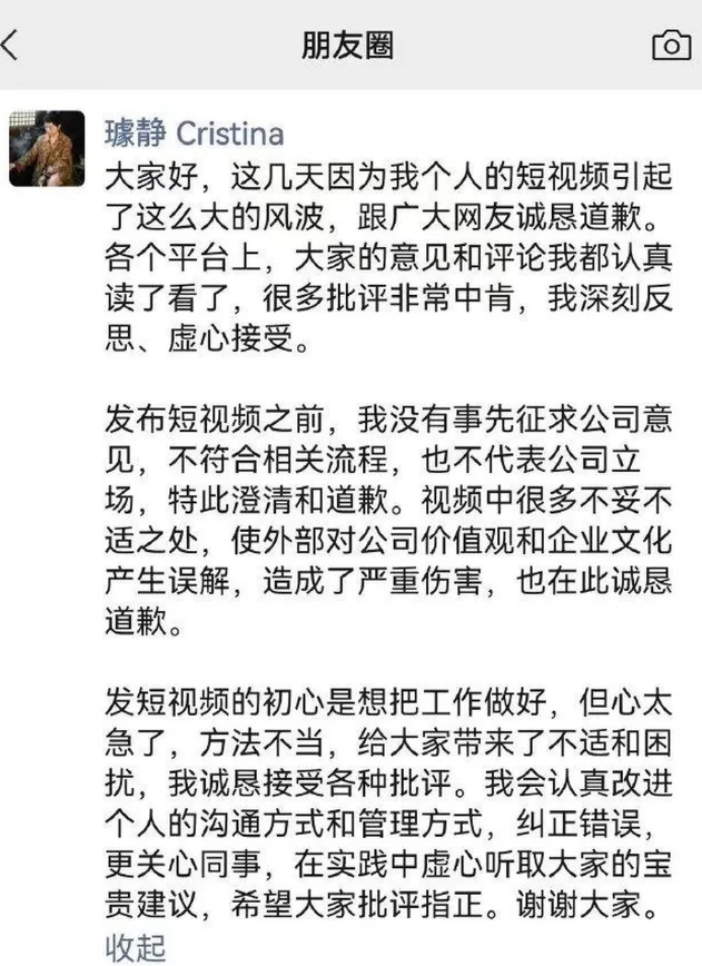 最后,璩静表示,心太急,方法不当,给大家造成了不适和困扰,诚恳接受各种批评,并会认知改进个人沟通方式和管理方式,纠正错误,更关心同事。