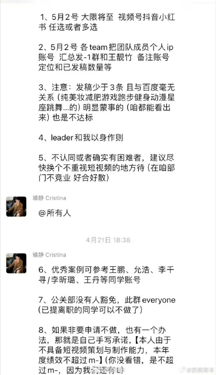5月7日,百度公关副总裁璩静亲自下场在抖音做短视频事件引发争议,五一小长假5天发了4条短视频,「粉丝数5天内达到95万」。