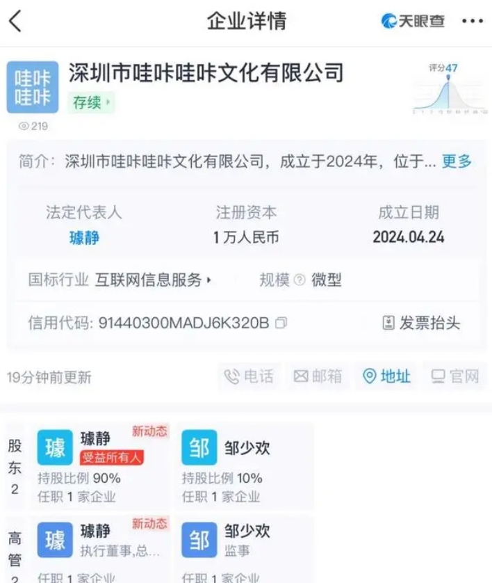 离职后,我们发现百度原副总裁璩静,离职前已注册公司,天眼查APP查询到深圳市哇咔哇咔文化有限公司于今年4月24日成立,这是一家以从事互联网和相关服务为主的企业。该公司注册资本1万元人民币,法定代表人是璩静,璩静持股比例90%,邹少欢持股比例10%。