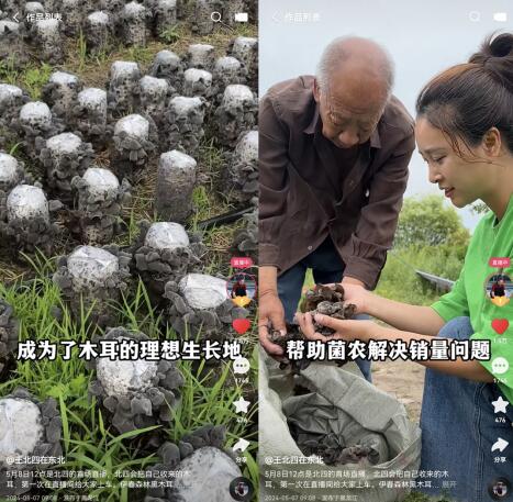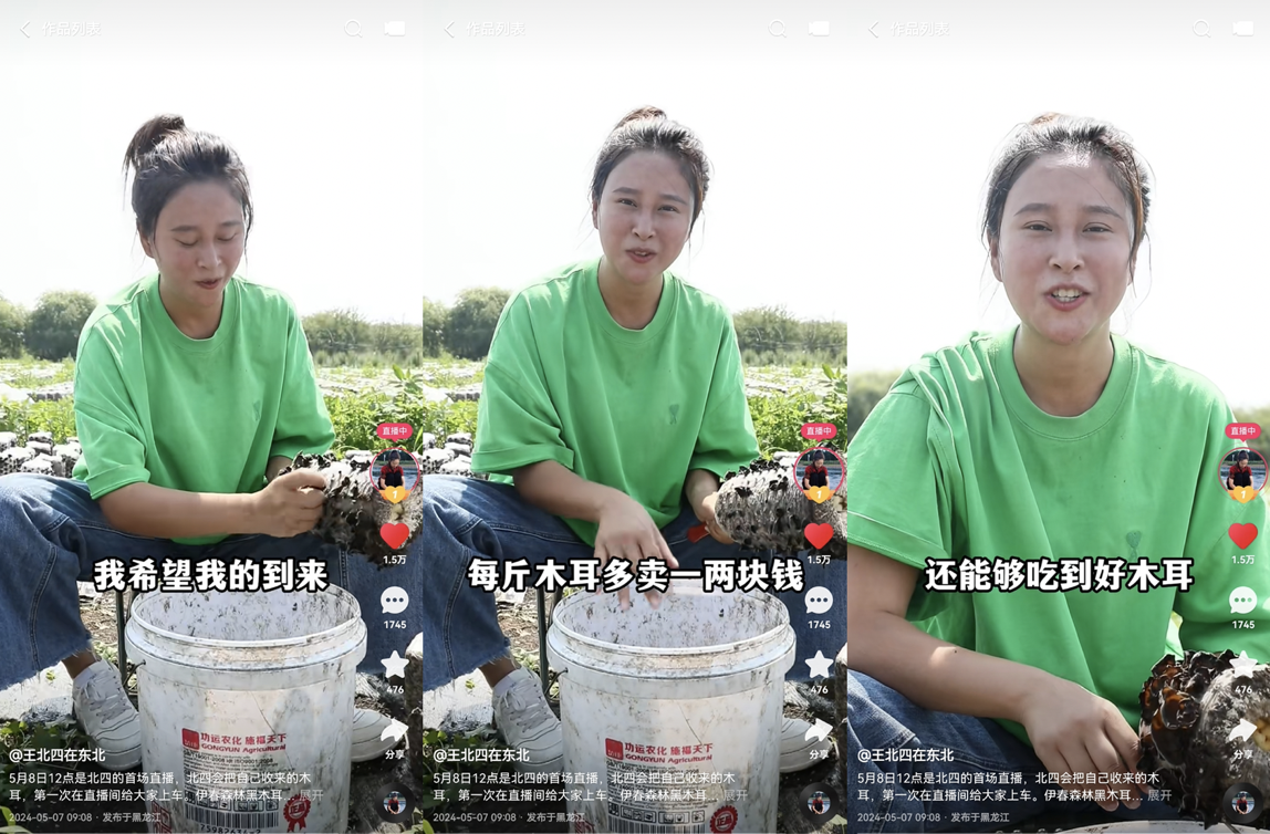 同时,这也是一场践行她“助农”初心的直播。直播前夕,王北四就曾发布预热短视频,向老铁们预告自己将首次在直播间上车伊春黑木耳,并展示了菌农们手工完成的各道工序。