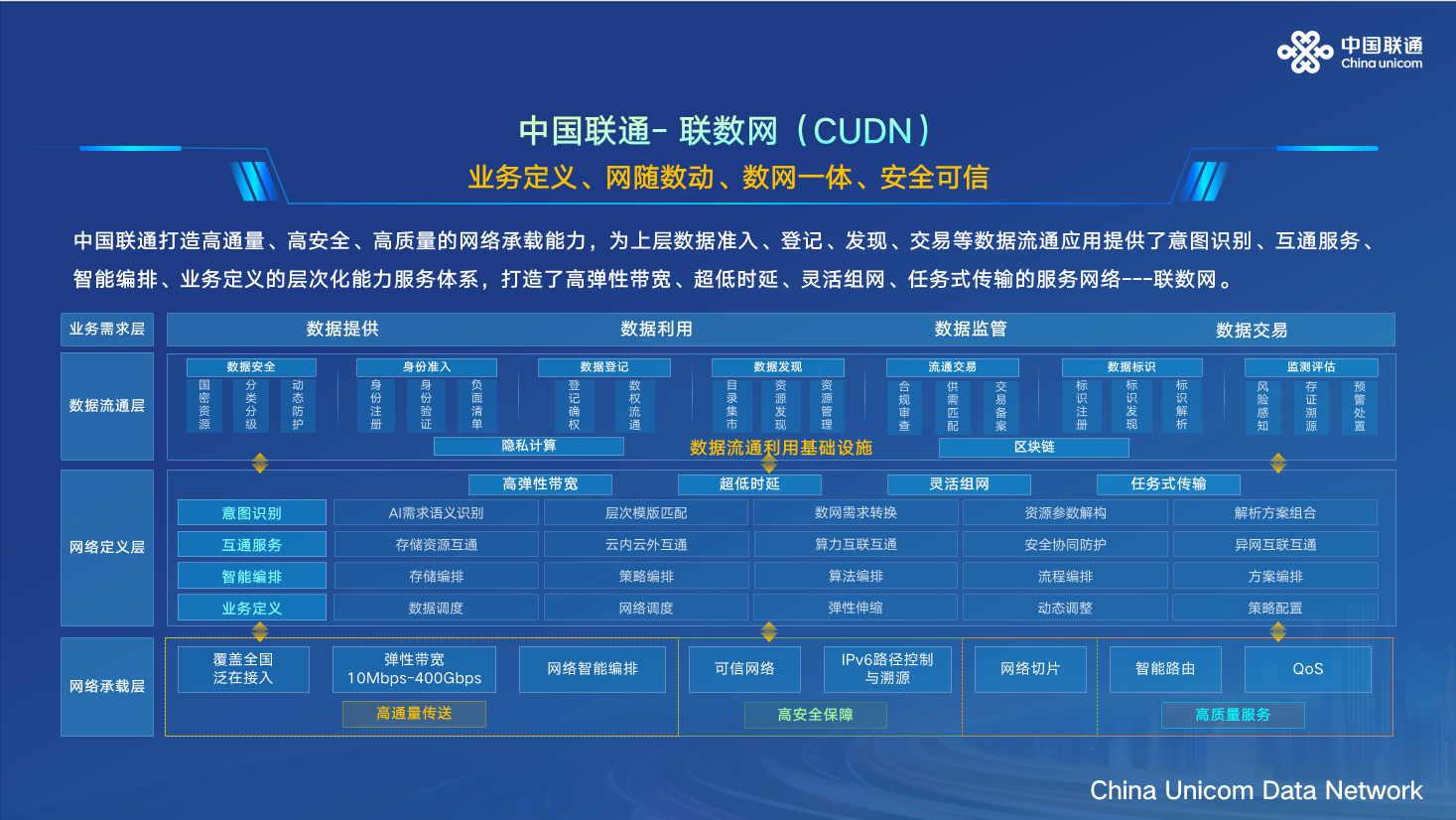 中国联通基于高通量传输、高安全保障、高质量服务的承载网,基于泛在接入、10M到400G的弹性带宽等承载能力,为上层数据准入、登记、发现、交易等数据流通应用提供了意图识别、互通服务、智能编排、软件定义的层次化能力服务体系,打造了高弹性带宽、超低时延、灵活组网、任务式传输的数据高速网络---联数网,形成业务定义、网随数动、数网一体、安全可信的特色能力优势。
