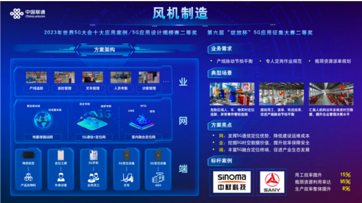 该项目中,中国联通携手三一重能,针对企业员工、AGV、叉车、电机、叶片等管理对象数量多、数据同步及时性差等管理痛点,通过加设“5G+北斗+UWB”融合定位终端,实现厂区内人、车、物的亚米级高精度位置信息汇总采集,并依托联通5G网络将定位数据实时回传到管理后台,打造人员工位级工时统计管理、产线节拍脉动平衡优化、物流派单调度等多个场景应用,助力一线员工的人员效能提升15%,叉车等瓶颈资源利用率提升至95%,厂区生产效率整体提升8%。该项目的落地应用切实提升了企业经济效益,受到行业的广泛关注和一致好评。项目先后获得第六届“绽放杯”5G应用征集大赛全国总决赛二等奖和世界5G大会揭榜赛二等奖,并成功入选世界5G大会十大应用案例。