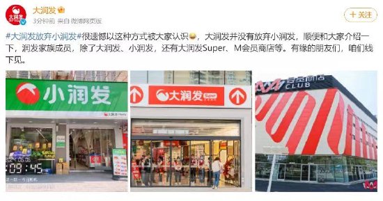 针对“大润发放弃小润发”相关报道,大润发官方回应表示:很遗憾以这种方式被大家认识,大润发并没有放弃小润发,顺便和大家介绍一下,润发家族成员,除了大润发、小润发,还有大润发Super、M会员商店等。有缘的朋友们,咱们线下见。