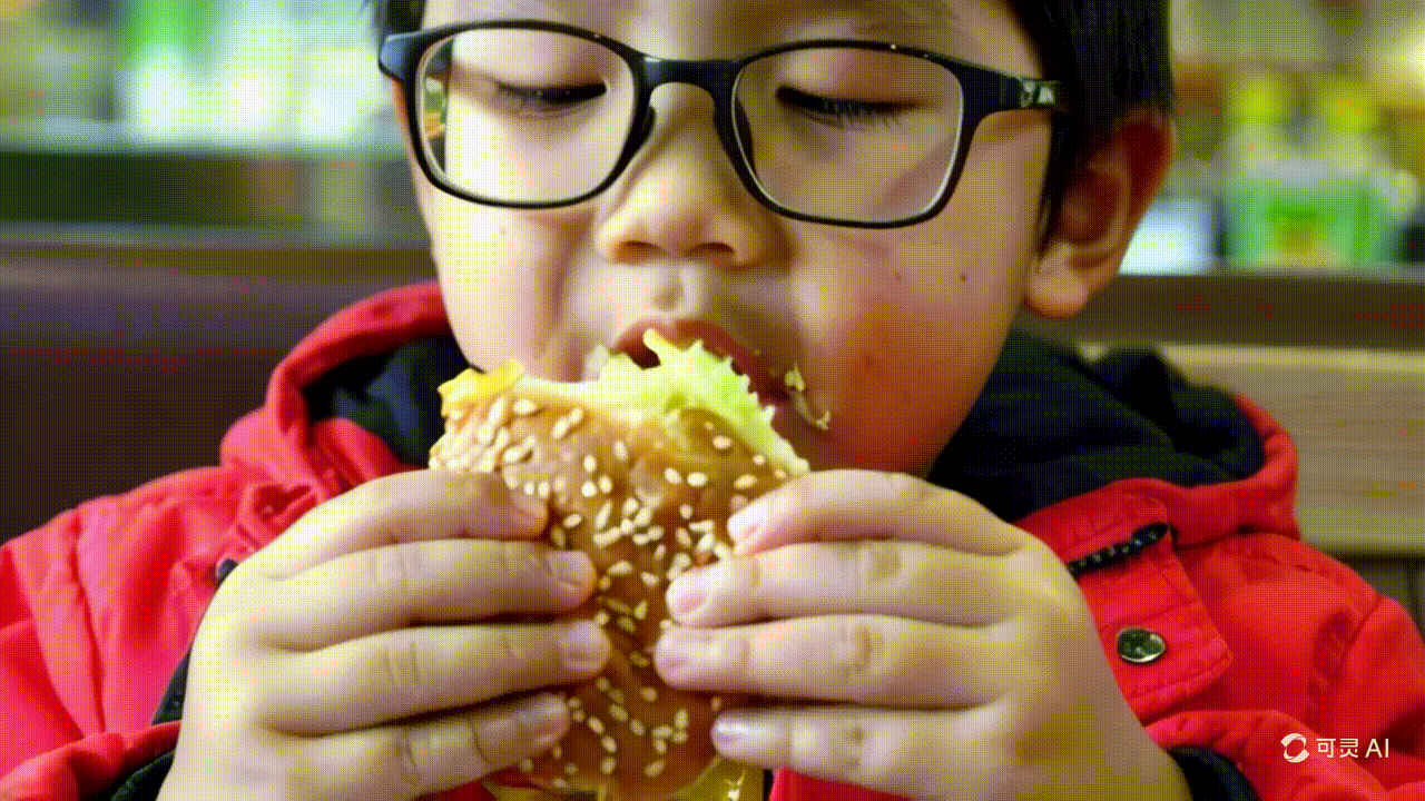 能够模拟真实物理世界的特性。得益于自研模型架构及Scaling Law激发出的强大建模能力,可灵大模型为我们构建起了一个无限逼近现实的想象空间,无论是真实世界的光影反射,重力影响下的流体运动,还是与物理世界的交互,可灵大模型都能够生成符合物理规律的视频。下面是小男孩吃汉堡的生成视频,一口咬下去,汉堡被咬掉一个大大的缺口,并在视频中一直保持。可以看到小孩咀嚼汉堡的享受表情,脸部的肌肉动态非常逼真。
