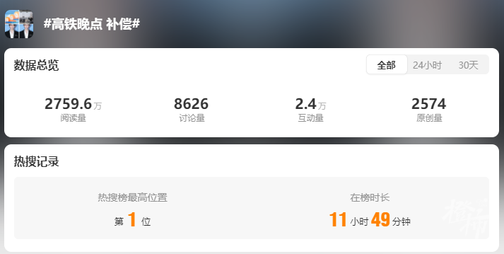 6月19日消息,据国内多家媒体报道,有网友晒出“高铁晚点补偿标准”,相关话题“高铁晚点补偿”冲上了微博热搜榜。