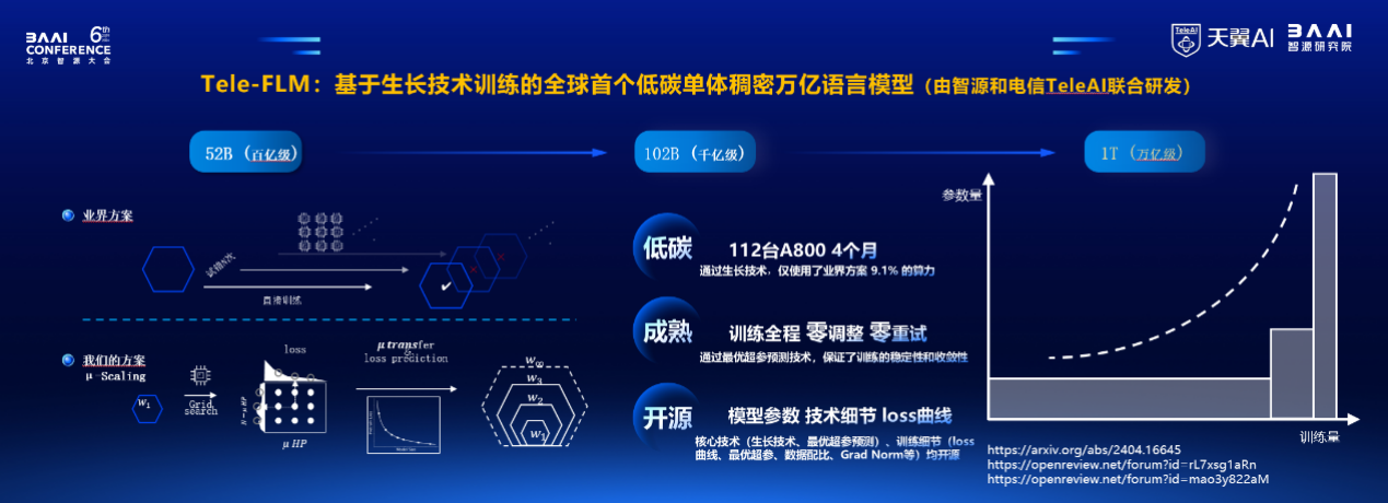 6月14日,在北京智源大会上,中国电信人工智能研究院(TeleAI)联合北京智源人工智能研究院发布全球首个单体稠密万亿参数语义模型Tele-FLM-1T,成为国内首批发布稠密万亿参数大模型的机构。