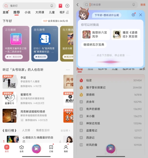 6月,喜马拉雅为用户开放提供了语音搜索页面功能。用户语音搜索感兴趣的内容关键词,可以唤起喜马拉雅为用户推荐的相关内容,极大地丰富了音频用户的收听使用体验。