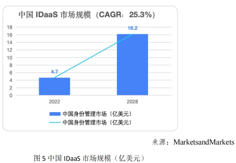 我国政策的指引和企业需求的驱动使 IDaaS 技术成为身份管理市场的主流选择。《“十四五”规划》 、《党的二十大报告》、《数字中国建设整体布局规划》 等政策的出台,也促进了相关技术的融合和发展,加速了 IDaaS 身份云技术在各行业的普及和应用,推动了整个市场的技术进步和商业模式创新。白皮书指出,预计到 2028 年,中国 IDaaS 市场规模将达到 16.2 亿美元,复合年增长率为 25.3% 。