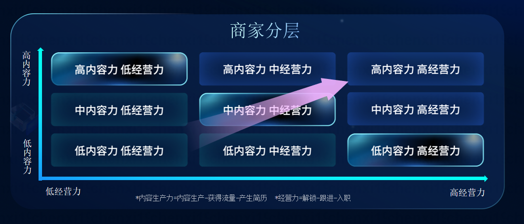 为了辅助快手快聘的生态伙伴进一步成长,快聘从内容力和经营力两位维度将整个商家进行了分层和分类进行精细化赋能。
