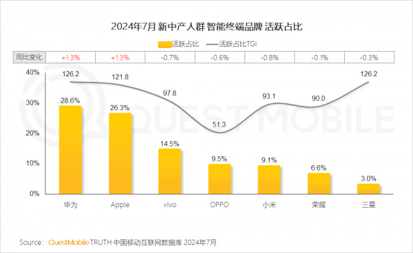这种现象同样表现在其他消费领域,消费者要么选择高端个性化产品,要么追求经济实惠、性价比高的商品。例如,智能新能源车市场上,新中产人群中表现强劲,智能汽车APP的渗透率达到12.8%,如小米SU7、智己LS6等车型因其智能配置和个性化设计而备受青睐。在智能手机的选择上,华为、Apple品牌活跃占比达28.6%、26.3%,与去年相比,均增长1.3%。
