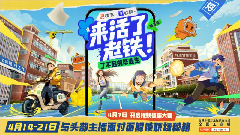 4 月 1 日,全国工商联、教育部、人力资源社会保障部在武汉联合启动 2025 年度 “百城千校万企” 促就业行动,明确了组织民企进校园、开展线上云招聘等一系列重要行动方向。近日,快手快聘迅速响应国家号召,重磅推出《来活了老铁!》第三季 “了不起的毕业生”,聚焦 “百城千校” 即将毕业的学生群体,量身定制打造专场直播带岗活动。