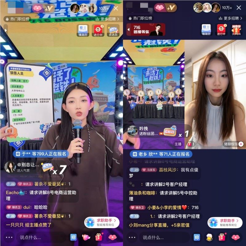 另一位快手创作者小伊伊的直播间同样热闹非凡。她不仅为其他企业直播带岗,还为自己的公司招聘电商运营助理和剪辑师等职位。直播间内设置了面试官连麦面试环节,面试官现场打分,全程直播观看人数超 700 万,收到近 4500 份简历,为毕业生提供了近距离与企业互动交流的平台。