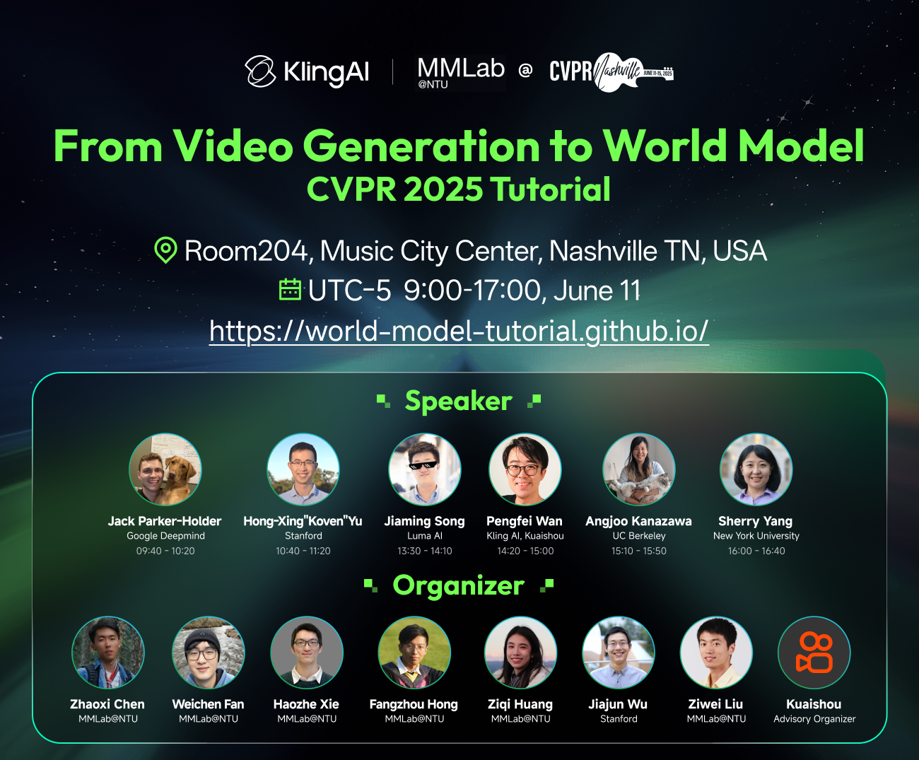 近日,全球视觉AI领域的年度盛会CVPR 2025在美国田纳西州纳什维尔召开,快手可灵AI事业部万鹏飞博士在备受瞩目的“From Video Generation to World Model” Tutorial(《从视频生成到世界模型》专题讲座)上,发表了题为An Introduction to Kling and Our Research towards More Powerful Video Genaration Models的报告,从模型架构与生成算法、互动与可控能力、效果评估与对齐机制、多模态理解和推理四大技术方向介绍了可灵AI团队在视频生成及世界模型领域的最新进展与思考。