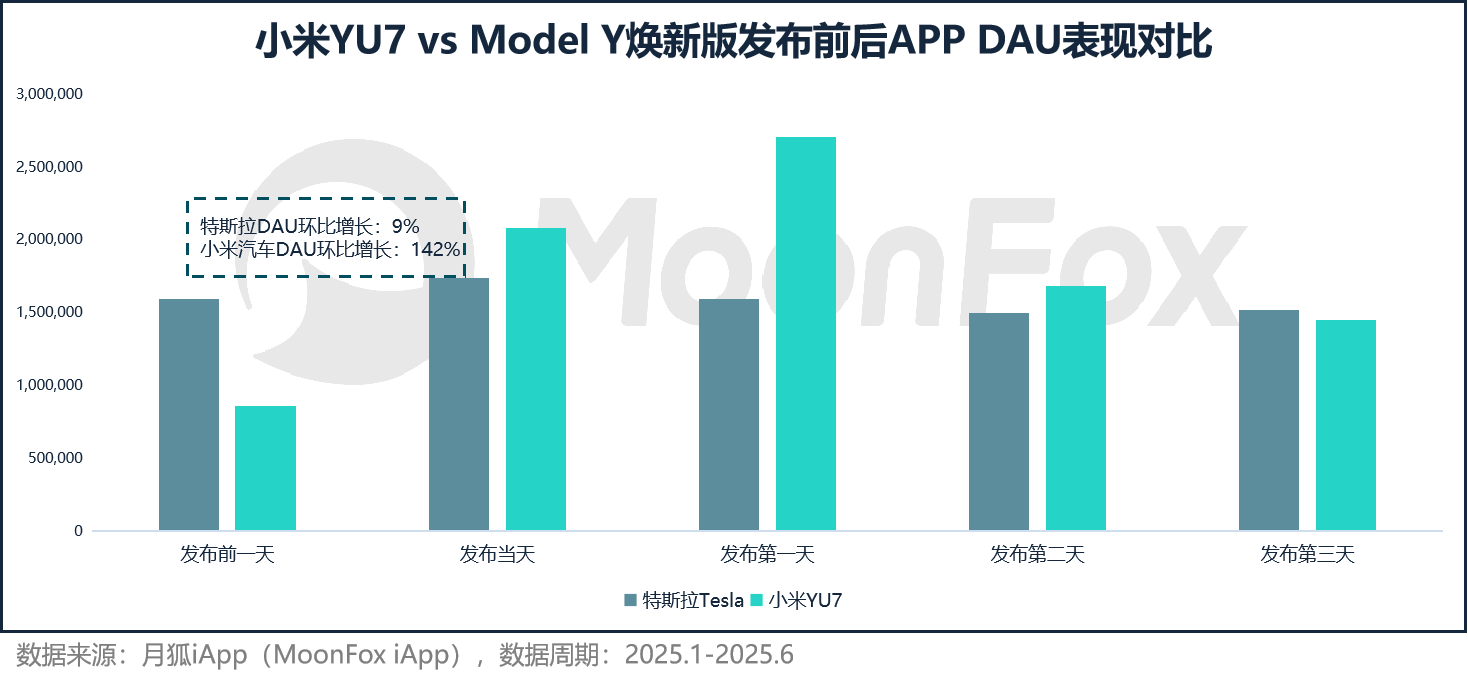 对比核心竞品特斯拉,在其今年年初发布Model Y焕新版当日,极光月狐数据显示特斯拉APP日活跃用户规模的环比增速仅为9%,远低于小米YU7此次发布带来的用户增长幅度。