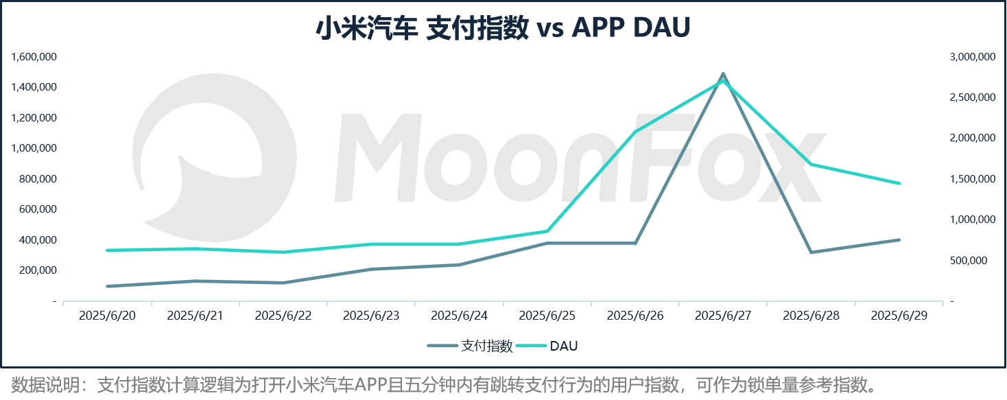 根据极光月狐数据,小米汽车APP在发布会当日活跃用户突破200万+,环比增速高达142%,并于次日(6月27日)达到峰值,为小米汽车带来了超过日常5倍的锁单用户。