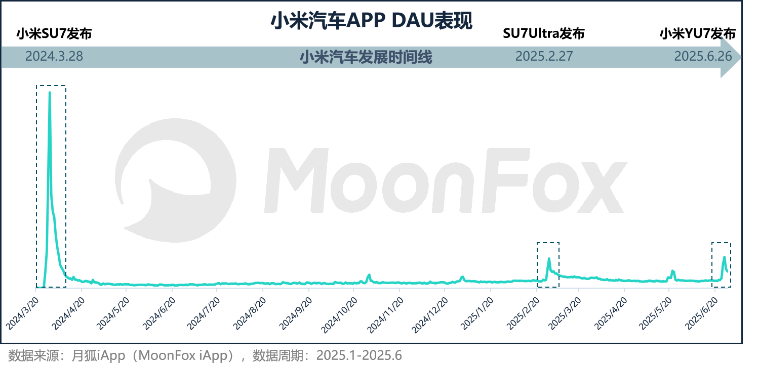 再回看小米SU7发布时的表现,2024年3月28日不仅是小米汽车APP DAU的爆发起点,更标志着小米造车业务从概念正式迈向商业化落地,其发布后陡峭的DAU增长曲线,充分印证了SU7引发的现象级市场热度。