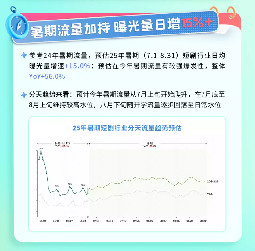 以Z世代为主力的年轻用户群体将在暑期进入高活跃季,数据显示,今年暑期内容消费类行业流量从7月上旬开始爬升,并将在7月底至8月上旬持续高涨。以短剧行业为例,参考去年暑期流量,今年暑期短剧行业日均曝光量增速预计超过15%,整体同比增长超56%。