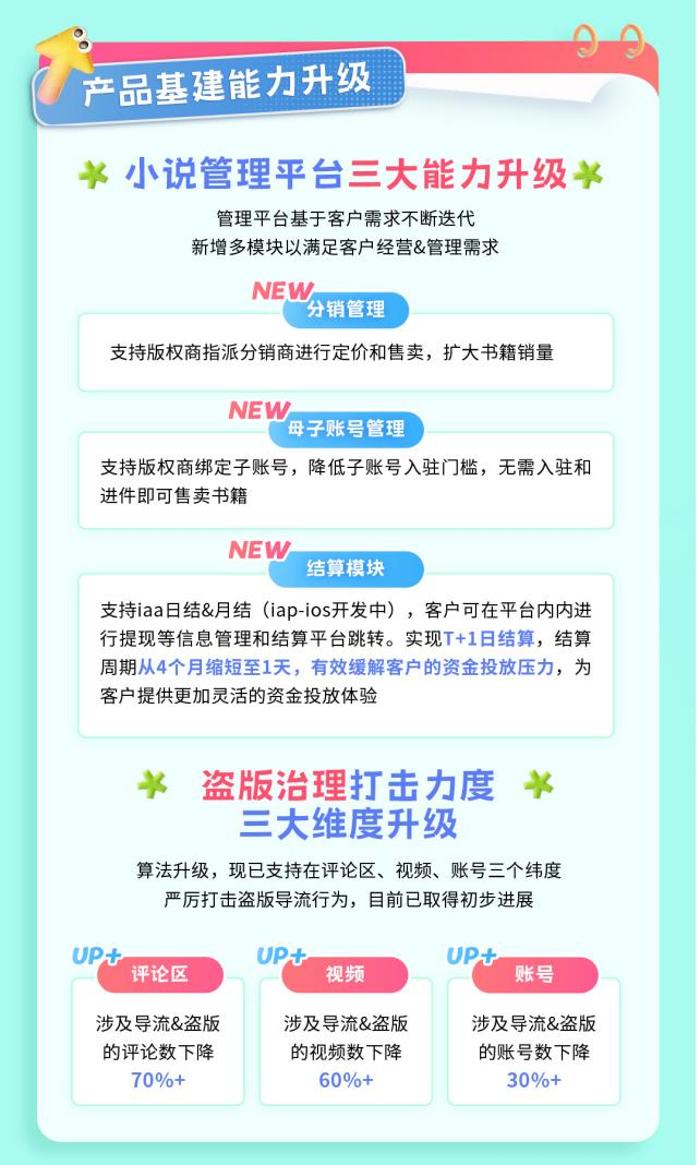 小说管理平台也将在暑期迎来全新迭代升级,新增分销管理、母子账号管理、结算模块的多模块功能,提升版权商的小说经营效率,助推小说销售,快速扩量。