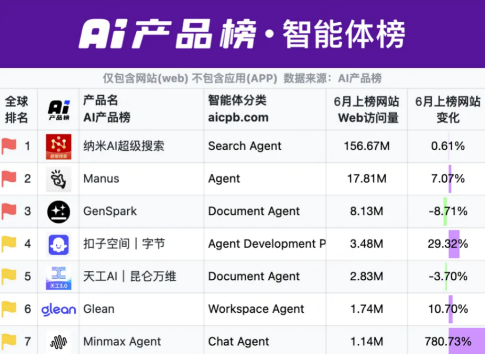 这一趋势在全球AI产品榜6月榜单中得到体现。榜单显示,2025年下半年以来,用户的关注点已逐渐从大模型转向更具场景价值的 AI 应用,作为AI应用的核心载体,智能体迎来新的爆发点。其中,纳米AI超级搜索发布自6月11日发布以来尚未满一个月,月Web访问量就高达156.57M,超过第二名Manus近9倍。