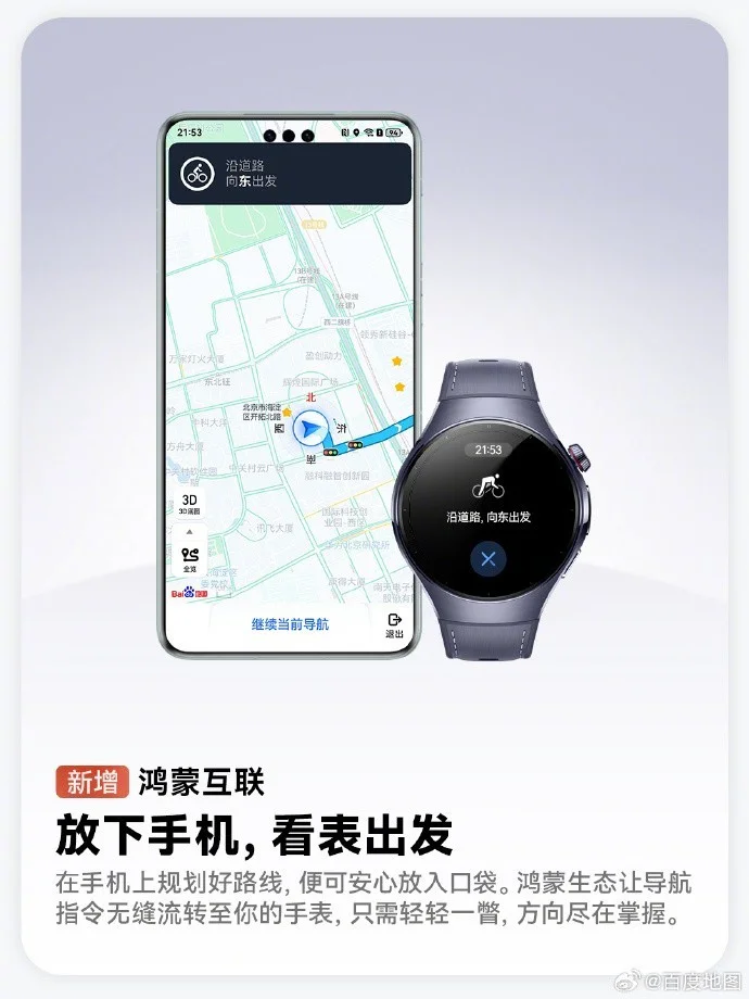 鸿蒙手机、手表互联,出行更安全:用户外出步行或骑行时,可将鸿蒙手机端的导航任务流转至手表,不用一直看手机,瞥一眼手表即可查看导航信息,让步行、骑行时的安全保障升级。