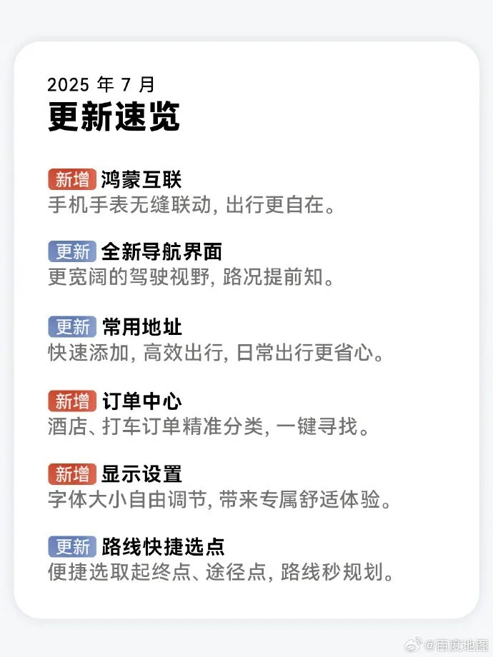 近日,百度地图官方微博宣布鸿蒙版百度地图迎来重大升级。此次更新集中上线了手机手表互联、手车互联、设置常用地址等多项功能,不仅强化了鸿蒙生态的设备协同能力,还在导航显示、个性化设置等功能上进行了优化,无论是日常通勤还是长途出行,都能提供更贴心、高效且无缝衔接的导航体验。