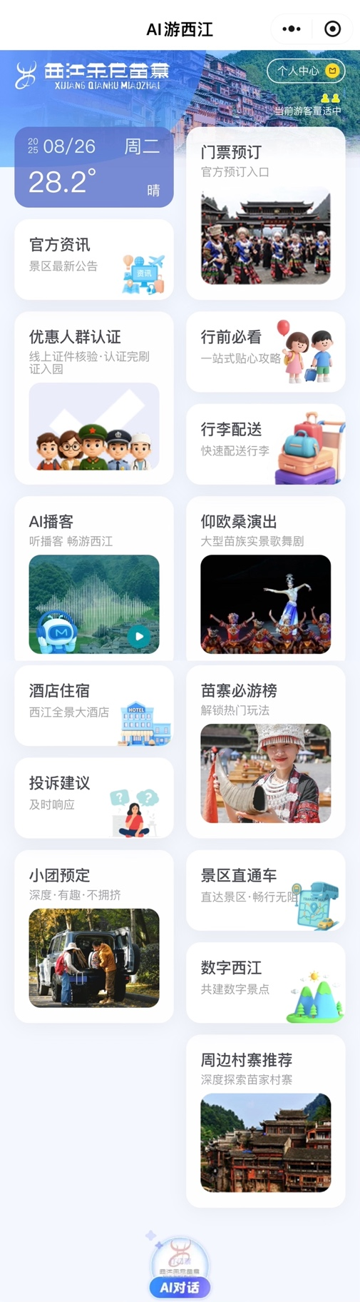 新版“AI游西江”智能体一改过去用户主动描述需求或提问的开放对话模式,采用卡片式布局,以多个清晰模块直观展示各项核心功能,首次实现景区服务的全流程数字化整合。游客通过统一入口即可完成行前规划、行中服务、行后反馈的全周期需求,大幅降低用户使用门槛,显著提升服务效率和精准度。