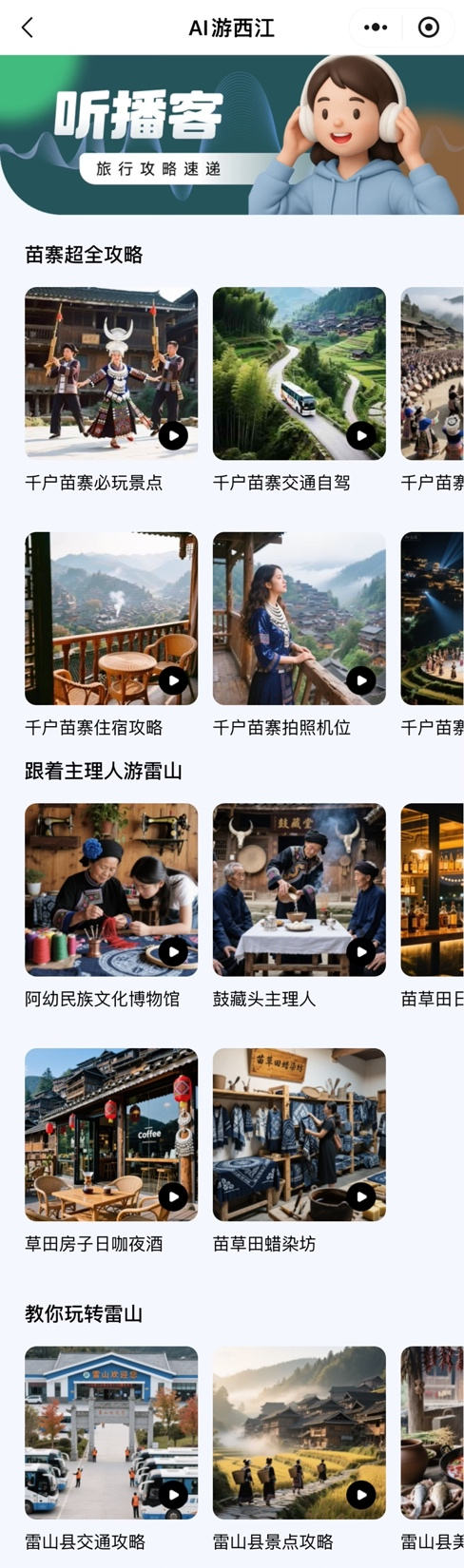 新增的AI播客功能针对自驾游用户或通勤场景设计,采用双人对话模式模拟真实电台互动。包含基于实时客流数据的避峰路线建议、隐藏打卡点推荐、方言版当地美食介绍等等,帮助用户在旅途中快速获取有价值的信息。周边村寨推荐则深度整合马蜂窝攻略,挖掘雷山丰富的村寨资源,带领游客在游览西江之余,发现更多远离人潮的小众村寨,体验更原生态的民族特色新玩法。