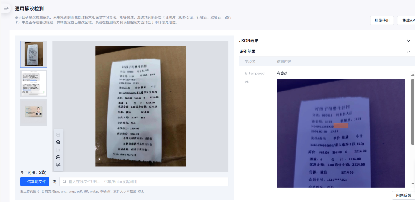真实的业务场景是检验技术实力的“考场”。据合合信息技术团队人员介绍,目前,基于AI图像模型和大量数据训练,合合信息自研TextIn通用篡改检测平台已落地应用于银行、保险、证券、零售、汽车等多个行业,支持财务凭证篡改检测、商场机打小票篡改检测以及身份证、护照、行驶证、驾驶证、港澳台证件等数十种常用卡证篡改检测,适配场景下,误检率低至千分之一。同时,针对企业及机构检测文档数量庞大、人工审核效率低的痛点问题,TextIn通用篡改检测平台针对单个样本可实现“毫秒级检测”,有效应对伪造图像的“规模化攻击”。