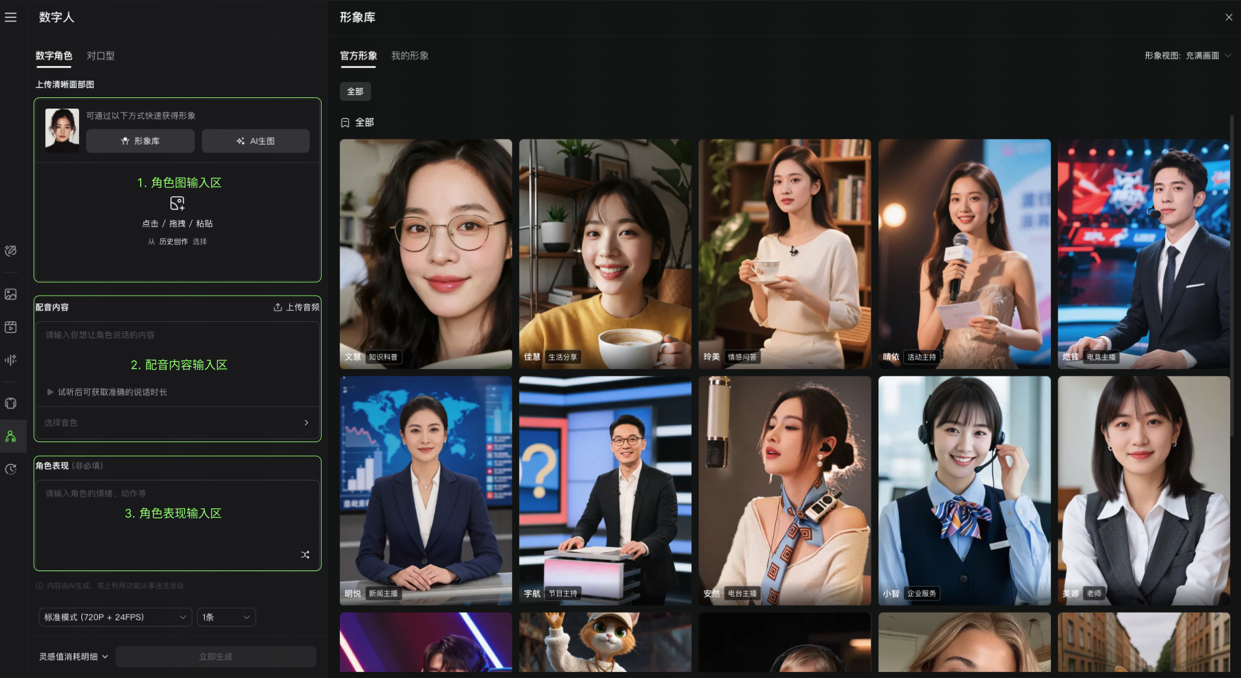 此外,为了实现“开箱即用”的便捷体验,可灵AI还提供了一站式解决方案。既支持用户上传自有素材,也可以使用内置的官方形象库、AI生图功能以及近百种TTS音色,轻松完成从角色创建到配音的全流程。