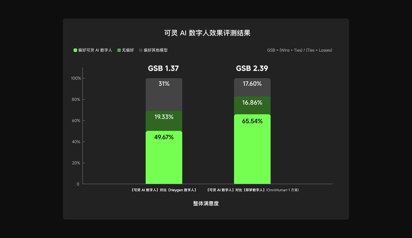 专业测试中,可灵AI数字人与行业知名产品Heygen及即梦数字人(Omnihuman-1方案)进行了效果对比。结果显示,可灵 AI 数字人在整体效果及多个细分维度上均表现优异,与即梦数字人(Omnihuman-1 方案)对比的整体 GSB 得分达到 2.39,与 Heygen 对比的整体 GSB 得分达到 1.37,位居行业领先。